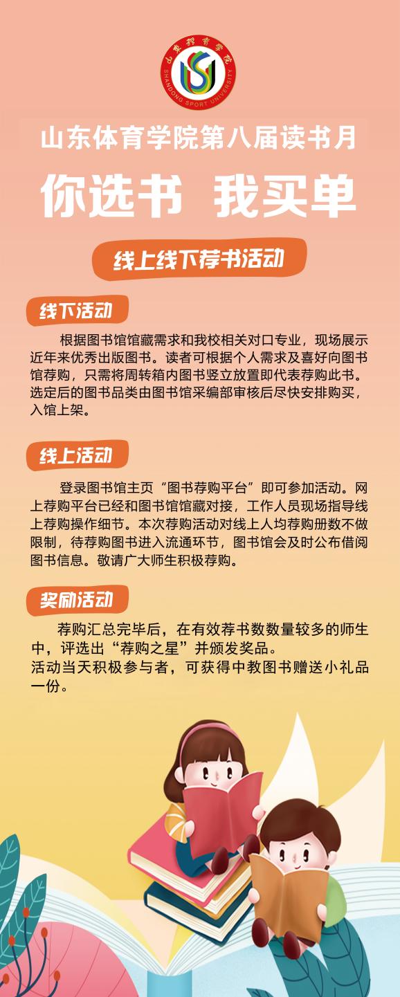 在全民阅读活动深入推进的大背景下,山东体育学院为营造浓厚的阅读氛围,提升师生阅读质量,特举办“你选书,我买单”线上线下图书荐购活动。此次活动旨在鼓励师生积极参与图书选采,让好书更快进入图书馆,满足广大读者的阅读需求,推动学校阅读文化的繁荣发展。
