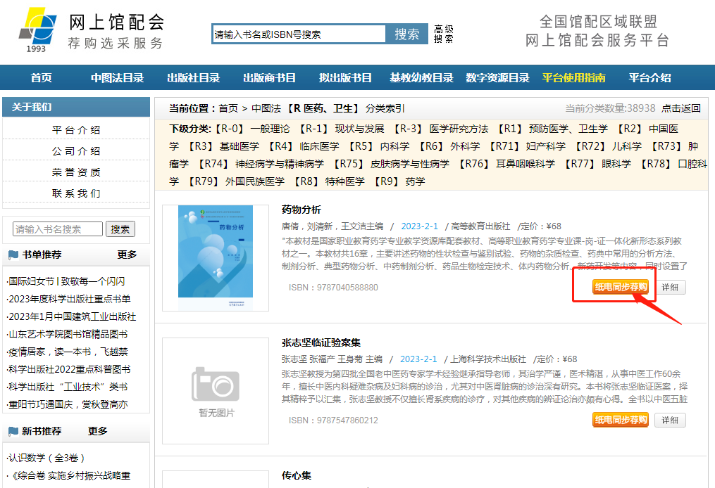以“出版社目录”为例,点击可查看全国500多家出版社的书目,并点击所选品类的“纸质书荐购”完成荐购