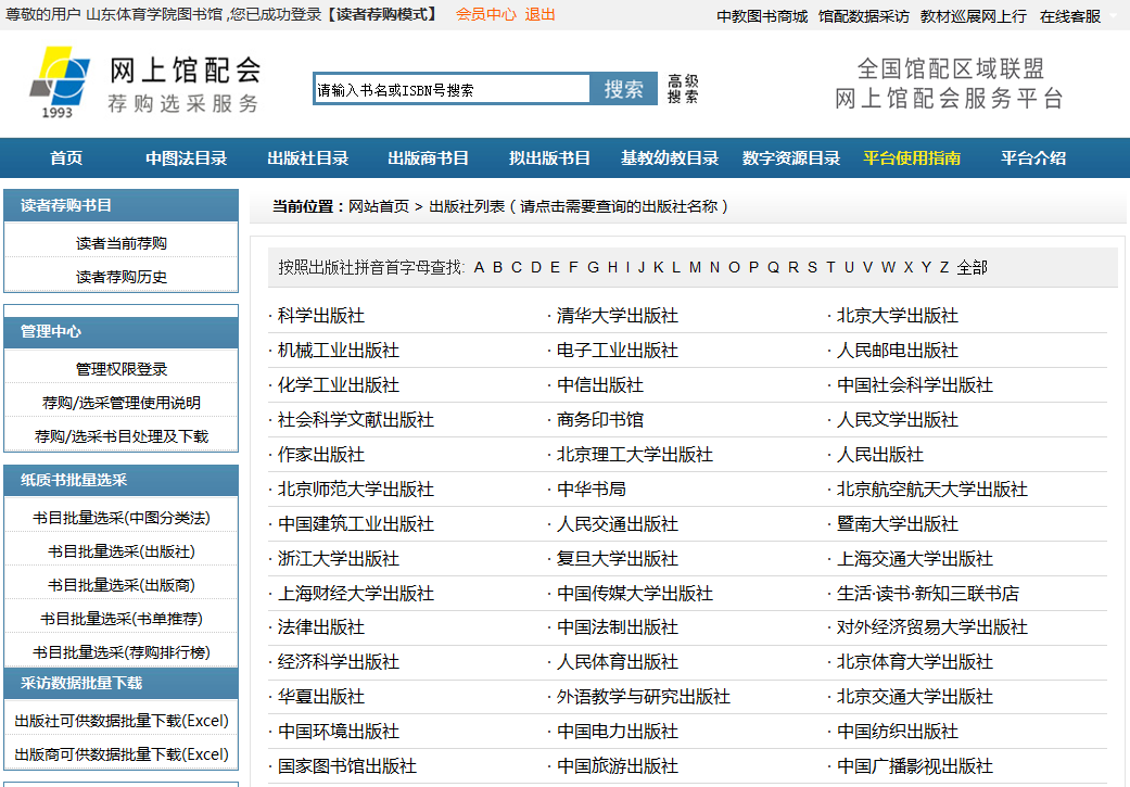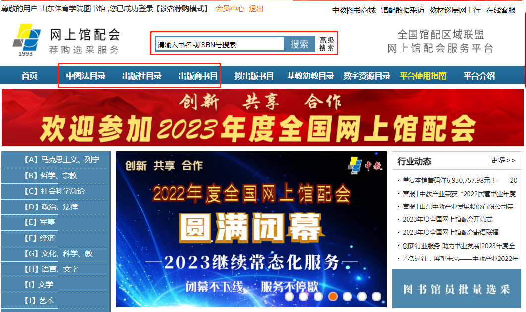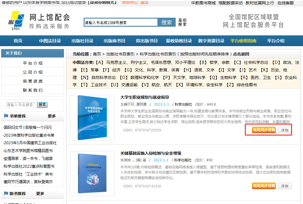 登录后读者可按专业、书名、作者、出版社进行产品搜索荐购,也可通过中图法目录、出版社目录等六大荐购目录模式选购图书。荐购目录具体位置如下图