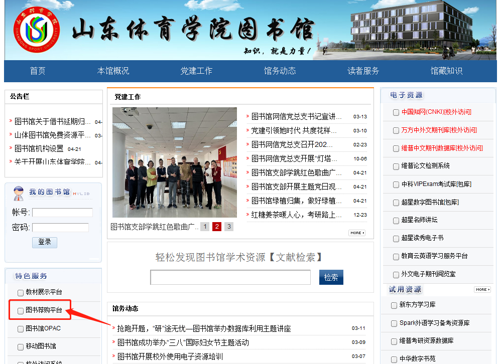进入山东体育学院图书馆网站首页(http://www.xindaijie.cn),点击首页“读者荐购”选项,即可使用“山东体育学院图书馆”的账号完成免密码一键登录,如下图: