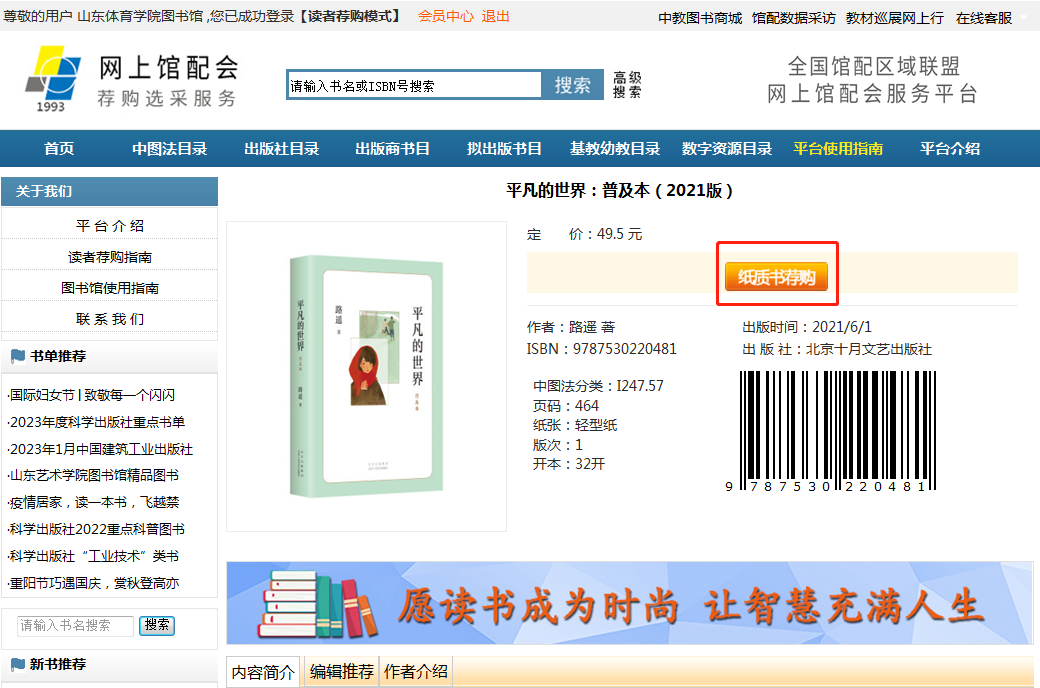 (2)现场荐购:师生可现场浏览书目,挑选自己感兴趣的图书进行荐购。荐购图书经图书馆采编部审核后,全加工并入馆上架。