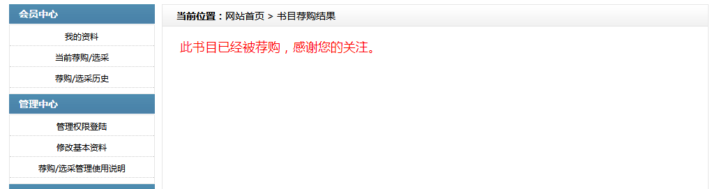 若本次荐购的图书没有馆藏且此书目没有被荐购过,则点击提交后显示如下: