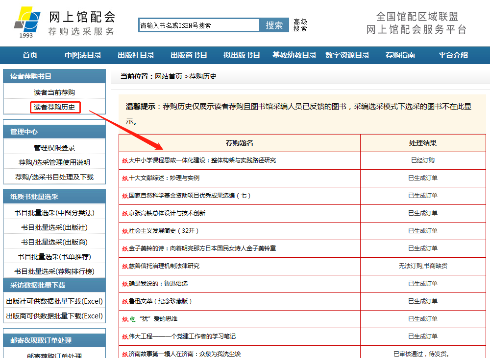 若想查看荐购的图书有没有被图书馆审核通过,则点击平台首页上方“会员中心”中的“读者当前荐购”和“读者荐购历史”。“读者当前荐购”仅展示读者荐购且图书馆采编人员尚未反馈的图书,“读者荐购历史”仅展示读者荐购且图书馆采编人员已反馈的图书。