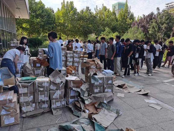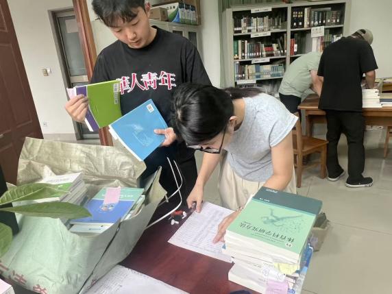 为避免人员聚集,图书馆采取“分年级、分时段、错峰领取”的方式开展教材发放工作。图书馆提前通知学生领取时间与地点,并组织志愿者进行现场引导分流。发放过程中,老师和学生志愿者严格核对教材清单与学生信息,确保“零误差”;志愿者们主动协助搬运、分发教材,现场秩序井然。