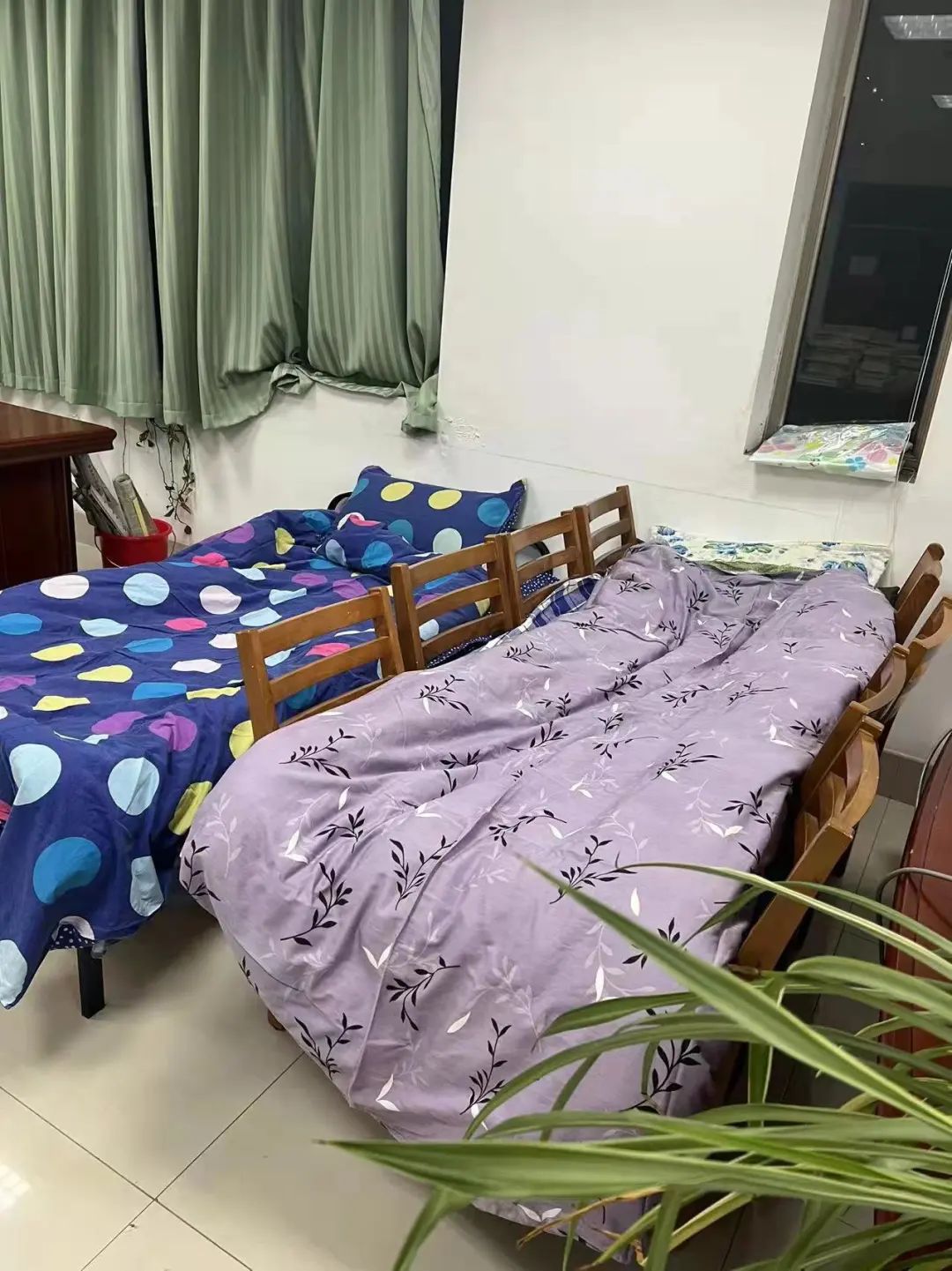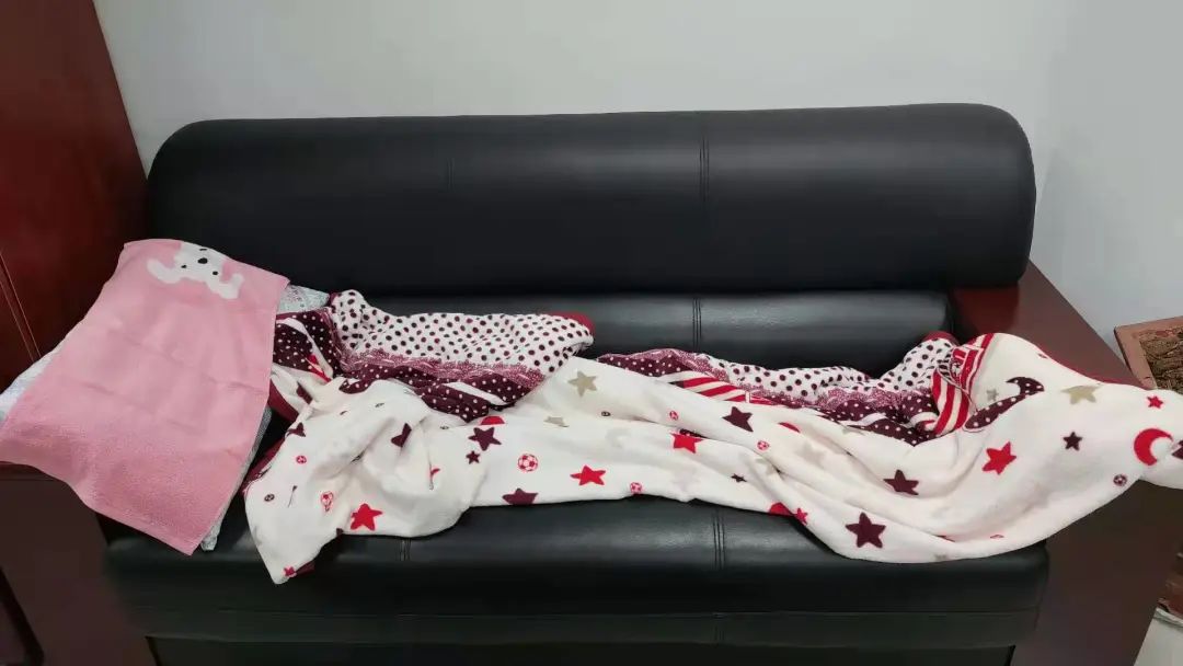 疫情突发,为了配合学校的防疫要求,驻馆老师们只能选择住在办公室内,借助现有条件简单解决住宿问题,用凳子拼在一起、睡在沙发上等等。