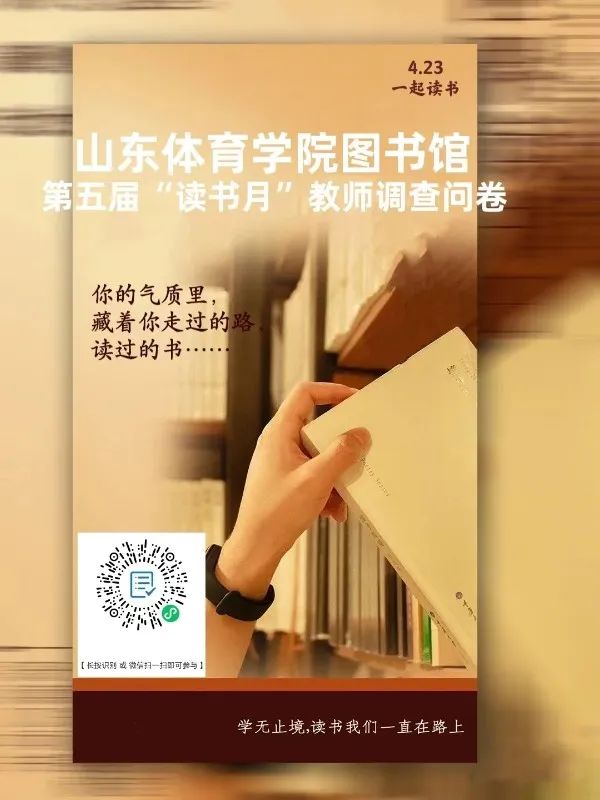本次调查问卷,面向山东体育学院全体师生,倡导用阅读引领成长。与好书为友、与经典对话、与博览同行,开阔视野,陶冶情操,积淀文化底蕴。以“博学、修身、砺志、笃行”为宗旨,在学校营造浓郁的读书氛围,让阅读成为一种习惯,让思考伴随人生。