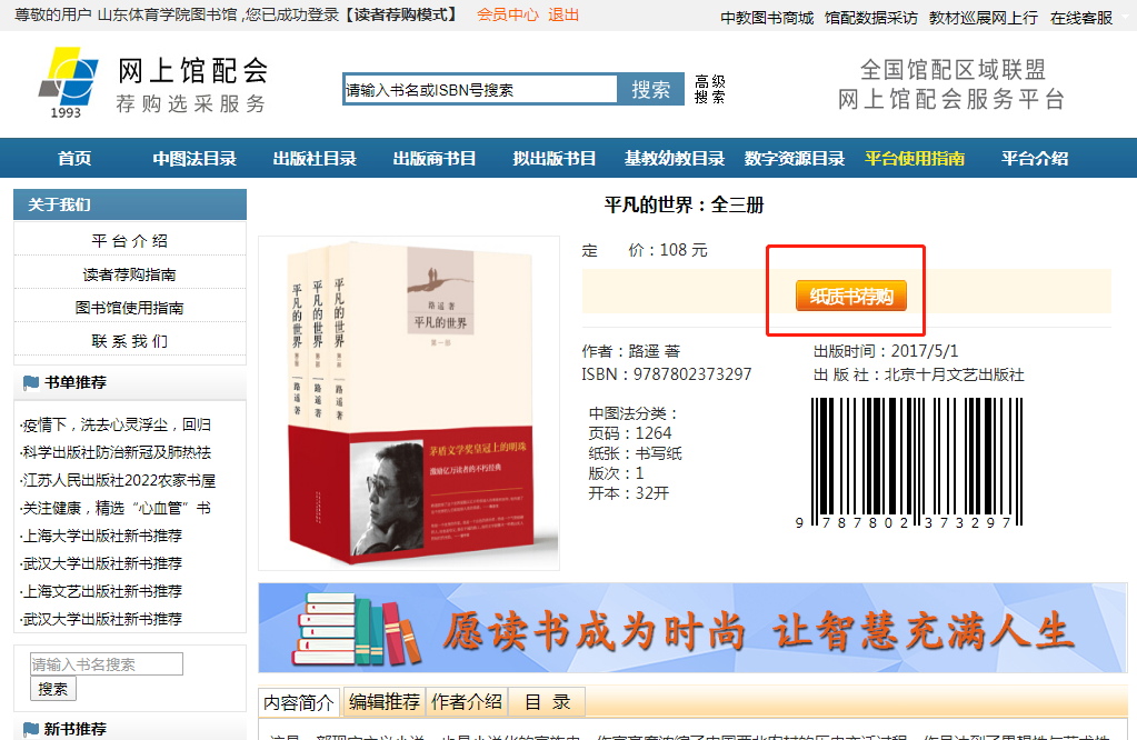 作为山东体育学院倡导全民阅读活动、迎接即将到来的全民读书月活动的重要表现形式。2022年,山东体育学院图书馆、山东中教产业发展股份有限公司“你选书,我买单”大型联合线上图书荐购活动在网上馆配会荐购选采服务平台(www.wsgph.com)全年常态化举行。活动作为学校世界读书月衍生活动的一部分,旨在促进学校良好的读书风气,使出版社出版的好书第一时间知会读者和图书馆,让同学和在校老师参与到图书选采中来,提升同学的阅读积极性。