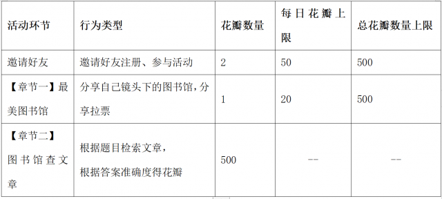 用户通过书单创建、书单收藏量、书单浏览量进行花瓣收集,最终根据个人书单所获花瓣总数排名进行评奖(活动结束时,个人书单获得花瓣数量累计之和),具体规则如下: